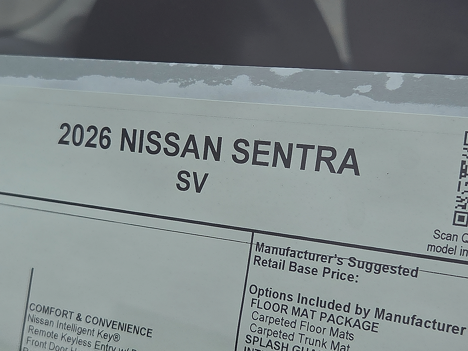 Super Black 2026 Nissan Sentra SV FWD CVT with Xtronic 2.0L I4 DOHC CVT with Xtronic Charcoal Cloth 16"Machined Alloy Wheels 4 Speakers 4-Wheel Disc Brakes ABS brakes Air Conditioning Alloy wheels AM/FM radio: Sirius Auto High-beam Headlights Automatic temperature control Body Colored Splash Guards (4-Piece) Brake assist Bumpers: body-color Delay-off headlights Driver door bin Driver vanity mirror Dual front impact airbags Dual front side impact airbags Electronic Stability Control Floor Mat Package Four wheel independent suspension Front anti-roll bar Front Bucket Seats Front Center Armrest Front reading lights Fully automatic headlights Illuminated entry Interior Door Scuff Protection Knee airbag Low tire pressure warning Nissan USB Charging Cable Set Occupant sensing airbag Outside temperature display Overhead airbag Overhead console Panic alarm Passenger door bin Passenger vanity mirror Power door mirrors Power steering Power windows Premium Cloth Seat Trim Radio data system Radio: AM/FM with RDS/MP3 Rear anti-roll bar Rear side impact airbag Rear window defroster Remote keyless entry Security system Speed control Speed-sensing steering Split folding rear seat Steering wheel mounted audio controls Tachometer Telescoping steering wheel Tilt steering wheel Traction control Trip computer Variably intermittent wipers Wireless Apple CarPlay/Wireless Android Auto CVT with Xtronic Charcoal Cloth.McLarty Daniel Nissan in Bentonville is one of the largest pre-owned dealer in NWA. Come see why we take pride in our customer satisfaction. 30/38 City/Highway MPGCall (479) 319-2652 today for more information about this vehicle! Price includes: $500 - Nissan CR MY26 Sentra (SV Trim) Bonus Cash - April. Exp. 05/04/2026 $500 - Nissan Customer Cash. Exp. 05/04/2026